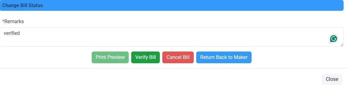 - Enter in Remarks like 'Verified' and click on Verify Bill.